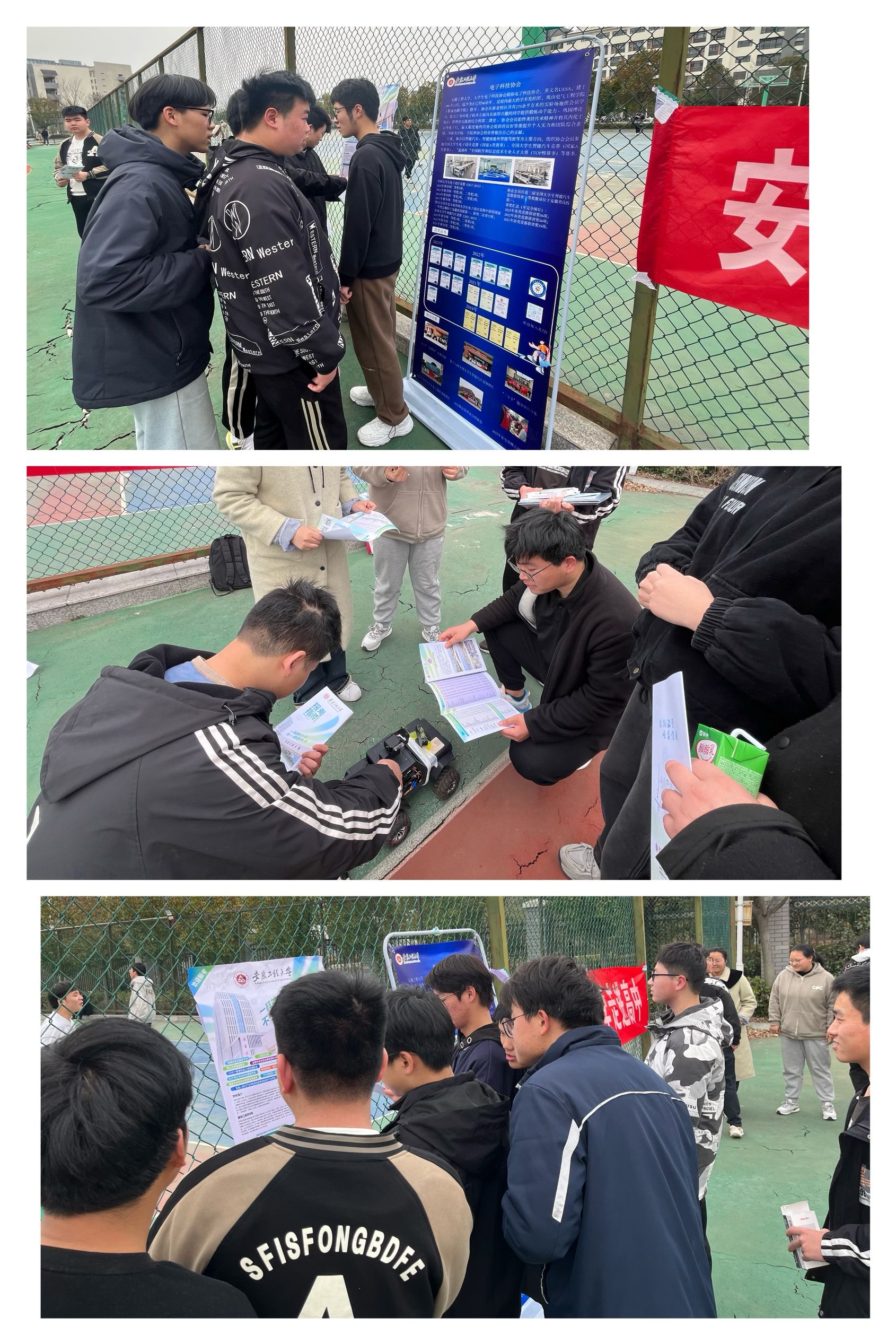 在明光中学操场,来自电科211班、电子科技协会科技部部长赵正天现场展示了自研的智能小车,吸引了大量同学驻足观看。他边操作,边与同学们交流了智能车中数理化知识的应用,着重介绍了学校丰富多彩的社团文化和科研竞赛优势,鼓励他们积极报考安徽工程大学。