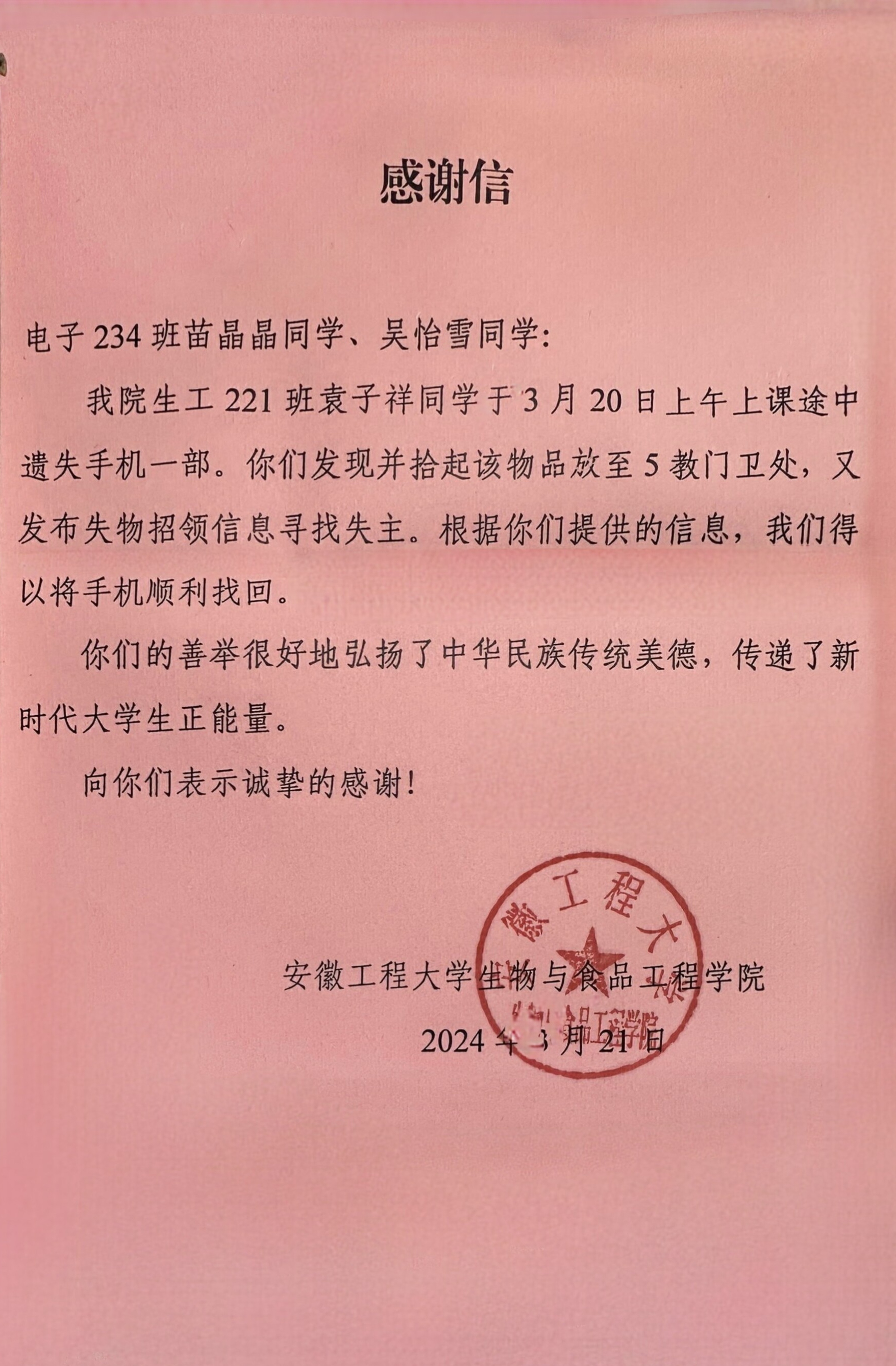 3月21日,老澳门六合彩开奖结果 收到了一封来自生物与食品工程学院的感谢信,信中表达了对电子234班苗晶晶、吴怡雪两位同学善心之举的感谢。