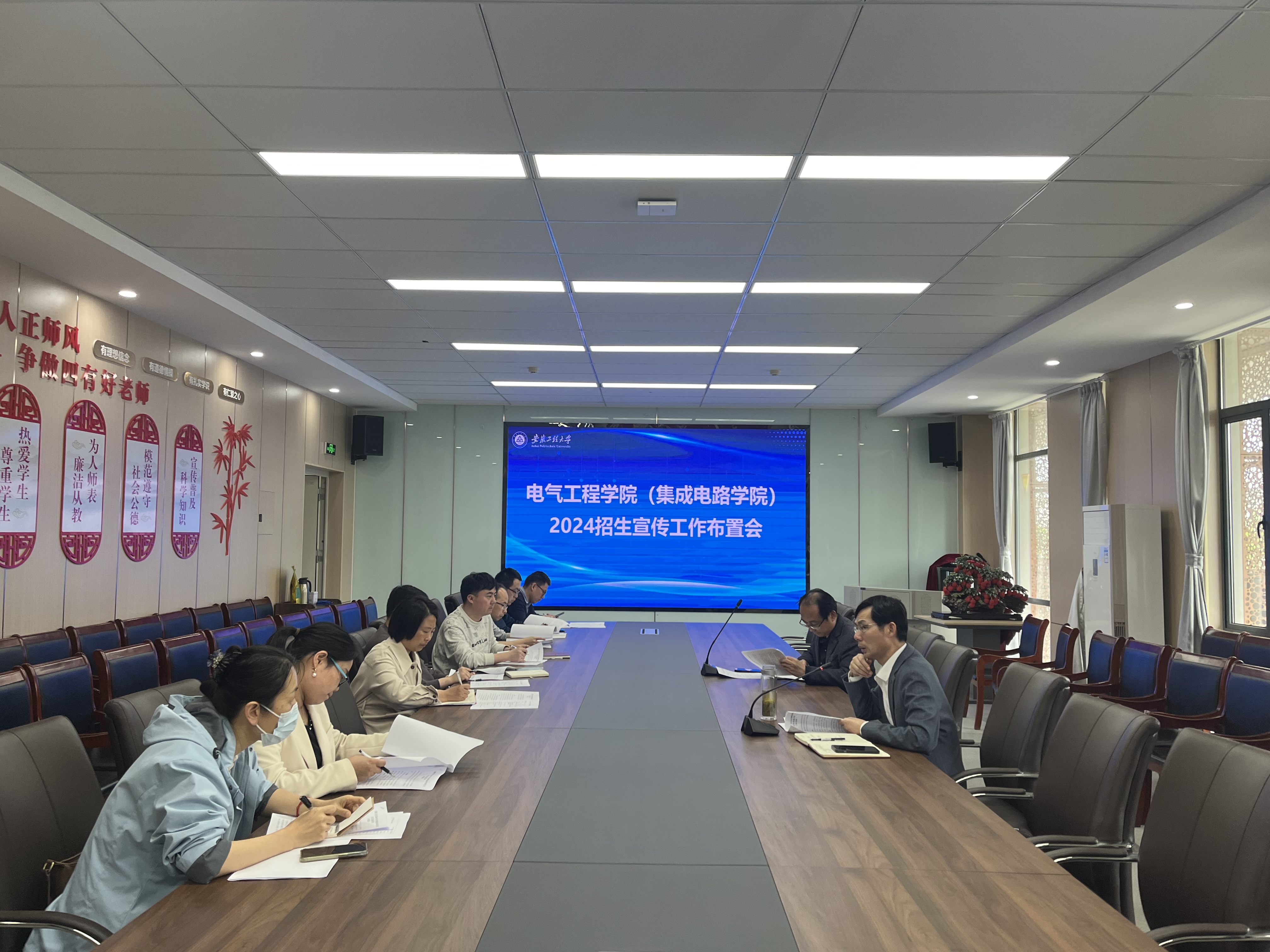 会上,杨会成领学了《安徽工程大学2024年全日制普通本科招生宣传工作实施方案》文件精神,通报了学院2024年招生工作任务推进安排,并就招生宣传等作了具体部署。他指出,要充分认清安徽省新高考改革面临的招生压力增大、专业面临社会考验等新挑战,提高政治站位,要有高质量的生源来激发办学活力;他强调,学院要强化组织领导,抓好统筹推进,严格落实工作责任,细化行动举措,积极调动各方资源投入招生,确保学院生源质量持续提升;他要求,招生宣传工作队伍要精准施策发力,提供优质服务,要将招生节奏整体前移,运用网络平台创新工作手段,线上线下同步推进;要紧密结合社会服务,加强生源基地建设与维护工作,抓好生源、不断提升招生工作的针对性和有效性。