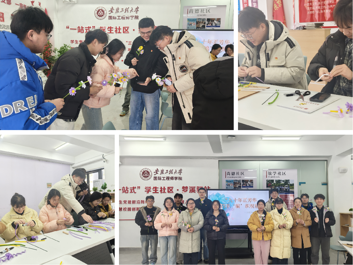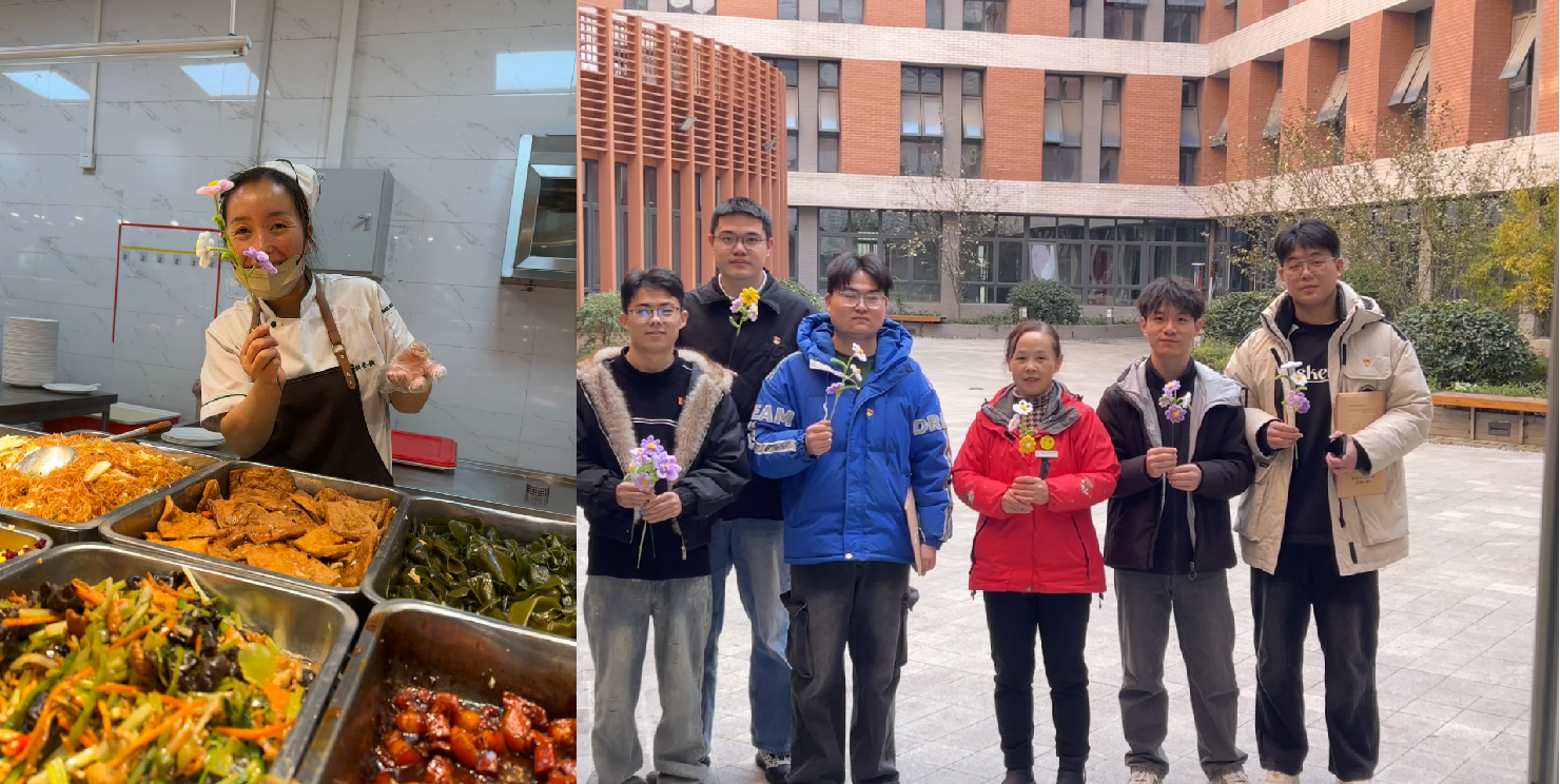 活动的尾声,支部将主题从“内化于心”延伸至“外化于行”。党员们并未将精美的花束留作己用,而是心怀感恩,化身温暖使者,将这一束束独一无二的扭扭花,亲手赠予了平日里默默奉献的宿管阿姨、食堂员工和辛勤授课的老师们。“阿姨您辛苦了!”“老师,谢谢您!”简单的问候,承载着深深的敬意与感谢。这一举动,让校庆的喜悦与党组织的关怀在校园内传递,生动践行了服务群众、感恩奉献的党员初心,为九十周年校庆增添了一抹温暖而亮丽的色彩。