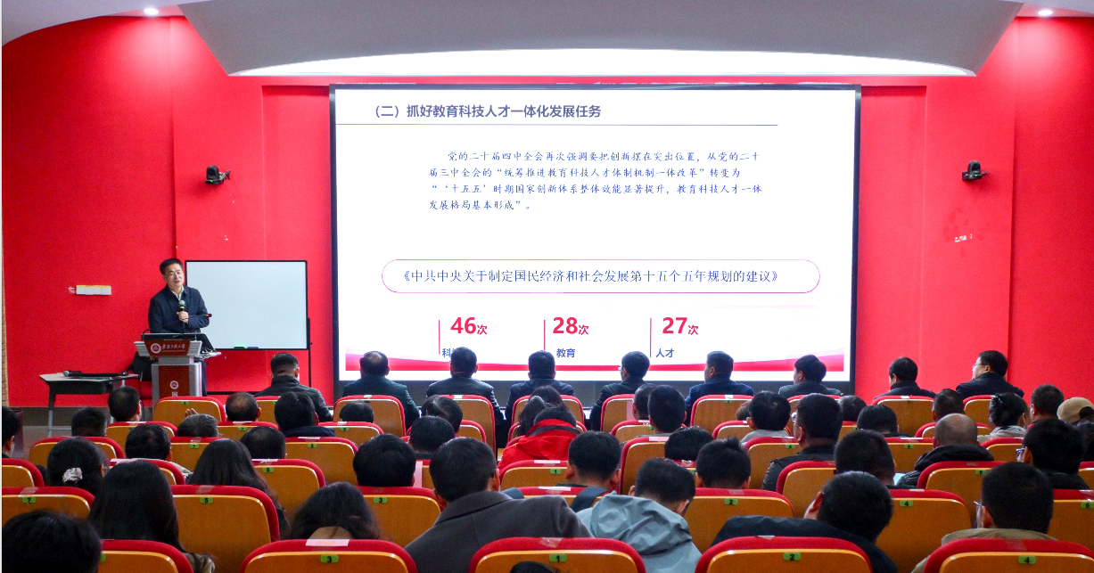 结合学校发展实际,黄友锐重点就如何全力以赴抓好党的二十届四中全会精神的贯彻落实进行了深入阐述。他特别聚焦教育、科技、人才“三位一体”协同融合发展,指明了学校未来的实践路径。提出,学校下一步将坚持平台思维,大力推动“学科交叉”与“资源整合”,旨在将学校的优势学科专业更精准地对接到国家战略和产业发展的迫切需求上。通过分层分类推进学科建设,着力构建能够有力支撑现代产业体系发展的学科专业群,从而提升学校服务经济社会发展的贡献度,并在中国式现代化建设中践行使命与担当